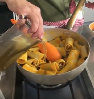 - LA FARCIA Preparare un soffritto con aglio e olio, rosolarvi la salsiccia precedentemente fatta a pezzettini. Aggiungere: i funghi secchi ammollati in un po’ d’acqua e un po’ di zucca lessata. Cuocere tanto quanto basta ad amalgamare bene questi 3 ingredienti: zucca, funghi e salsiccia. Unire abbondante #granapadano. Asciugare un po’ la farcia con una forchetta, schiacciare tenendola ancora un pochino su fuoco moderato. Più risulterà asciutta più facilmente la inserirete nei paccheri e meno si disperderà durante la cottura finale in padella.